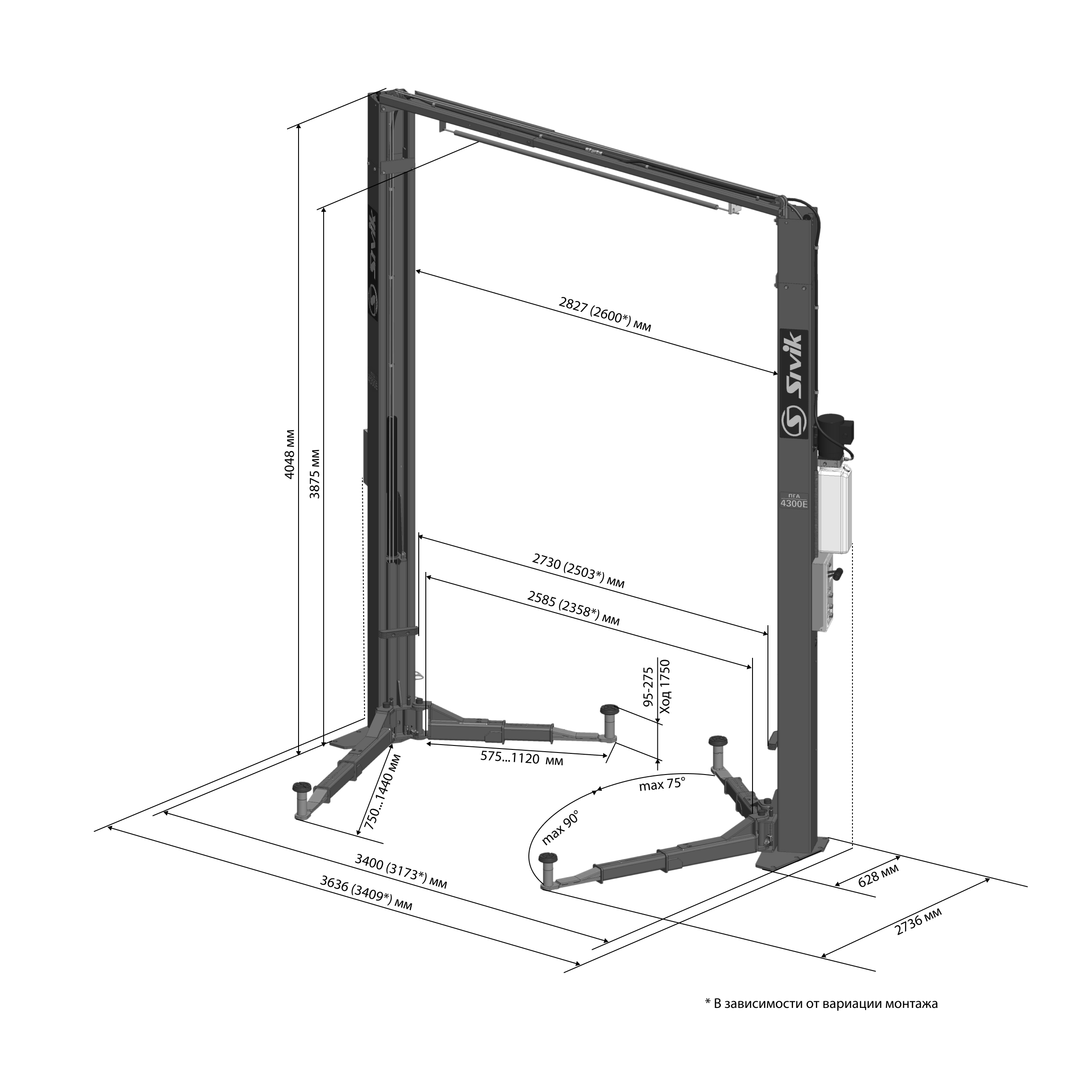 • Подъемник можно установить в двух вариациях: с увеличенной шириной проезда 2585 мм и со стандартной шириной проезда 2358 мм