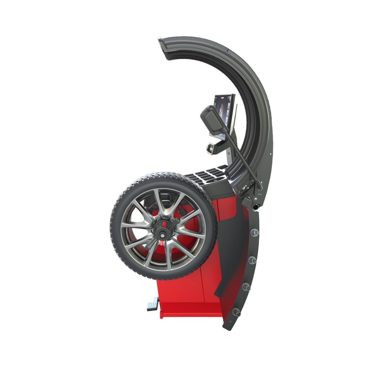 - Станок автоматически вводит ширину диска. УЗ-датчик моментально считывает ширину при опускании кожуха. Повышается скорость балансировки штампованных колес.